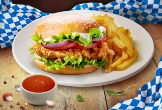 Contine: burger (chifla, snitel de pui, salata verde, rosii, ceapa, sos maioneza cu castraveti murati), cartofi prajiti si ketchup