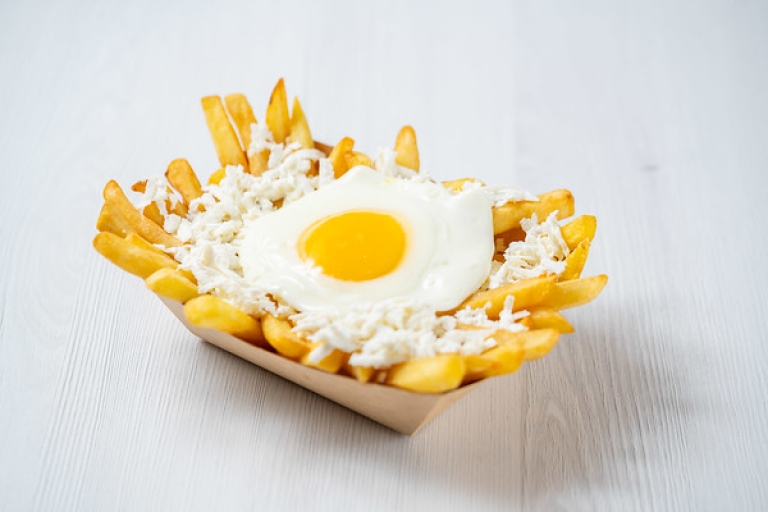 Contine: cartofi prajiti 150g, ou prajit 40g, branza telemea 25g