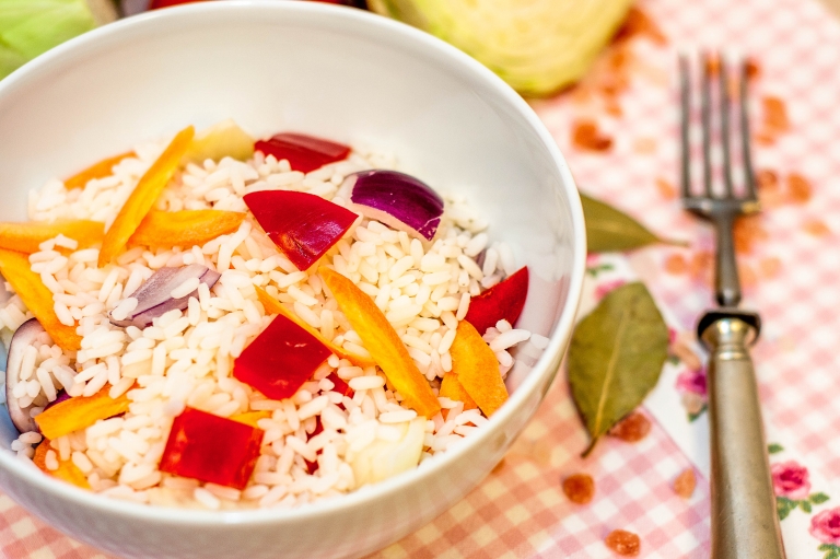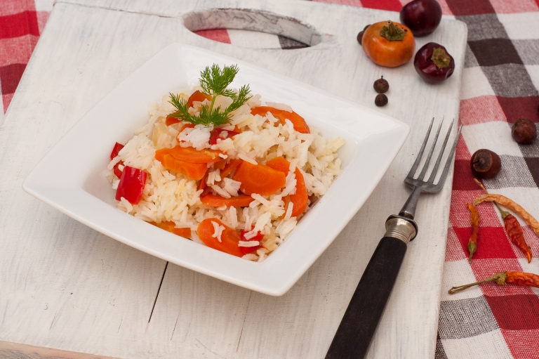 Ingrediente/portie: orez (75%), ceapa (5%), morcov (5%), ardei gras (5%), ulei de floarea soarelui, sare